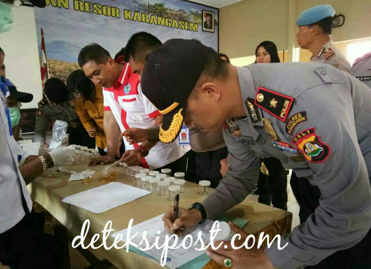 DETEKSIPOST.COM – KARANGASEM – Satuan Narkoba Polres Karangasen bekerjasama dengan Badan Narkotika Kabupaten Karangasen melaksanakan pemeriksaan urine secara mendadak bagi ratusan Personil Polres Karangasem dan Polsek jajaran yang dilakukan secara bergiliran, bertempat di Gedung Wira Satya Polres Karangasem, Bali. Kamis tanggal 6/09/2018