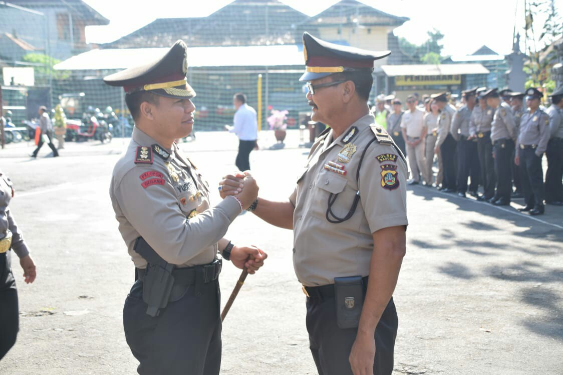 Seusai Upacara dilanjutkan dengan pemberian ucapan selamat dengan berjabat tangan oleh Seluruh Personil Polres Badung kepada IPDA I MADE SARJANA S.H.