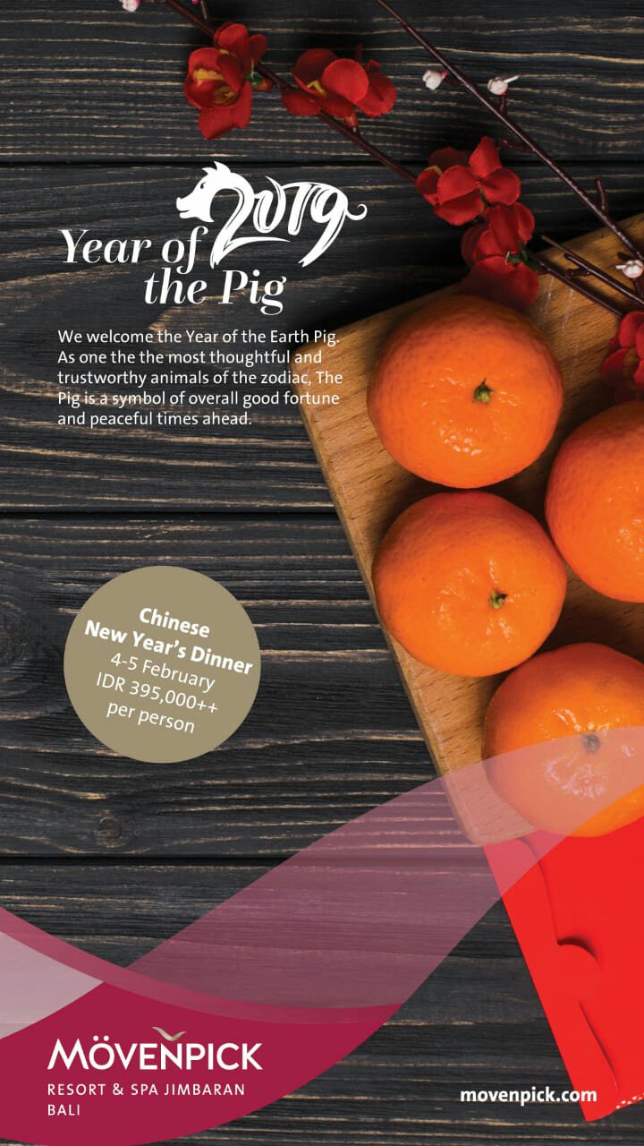 DETEKSIPOST.COM – KUTA – BALI, Chinese New Year 2019 at Mövenpick Resort & Spa Jimbaran Bali In 2019, the Chinese New Year falls on 5 February, and in the week leading up to that day. Huge celebrations will take place all over Asia. Typical Chinese New Year celebrations include dragon dances, feasts and giving gifts of red envelopes filled with money. 2019 is the Year of the Earth Pig.