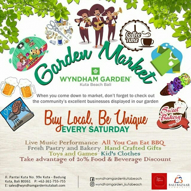 Wyndham Garden Market is a weekend market in front of Kuta Beach initiated by Yan Djuna Production and supported by Bali Bazaar Community. It is open to the public every Saturday for all things fresh, healthy and creative.
