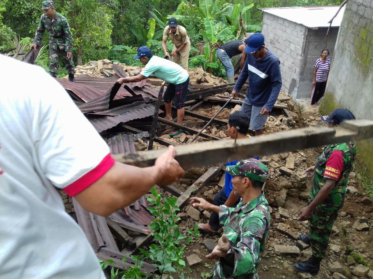 “Kita semua hari ini bergotong royong untuk membantu Nenek Nengah Santri membersihkan puing-puing rumah yang roboh akibat hempasan angin dan sekalian diperbaiki”, ungkap Danramil.