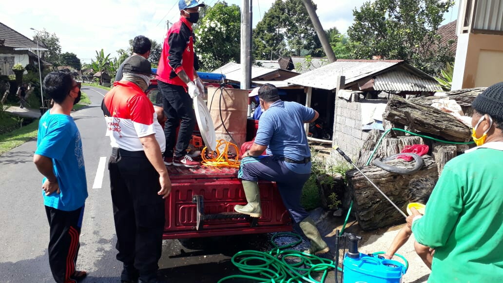 Desa adat Blahkiuh, kec. Abiansemal, Badung, pukul 09.00 sebelum melakukan penyemprotan di Desa adat Blahkiuh di seputaran jalan- jalan Utama dan jalan lingkungan Banjar se- Desa Blahkiuh.