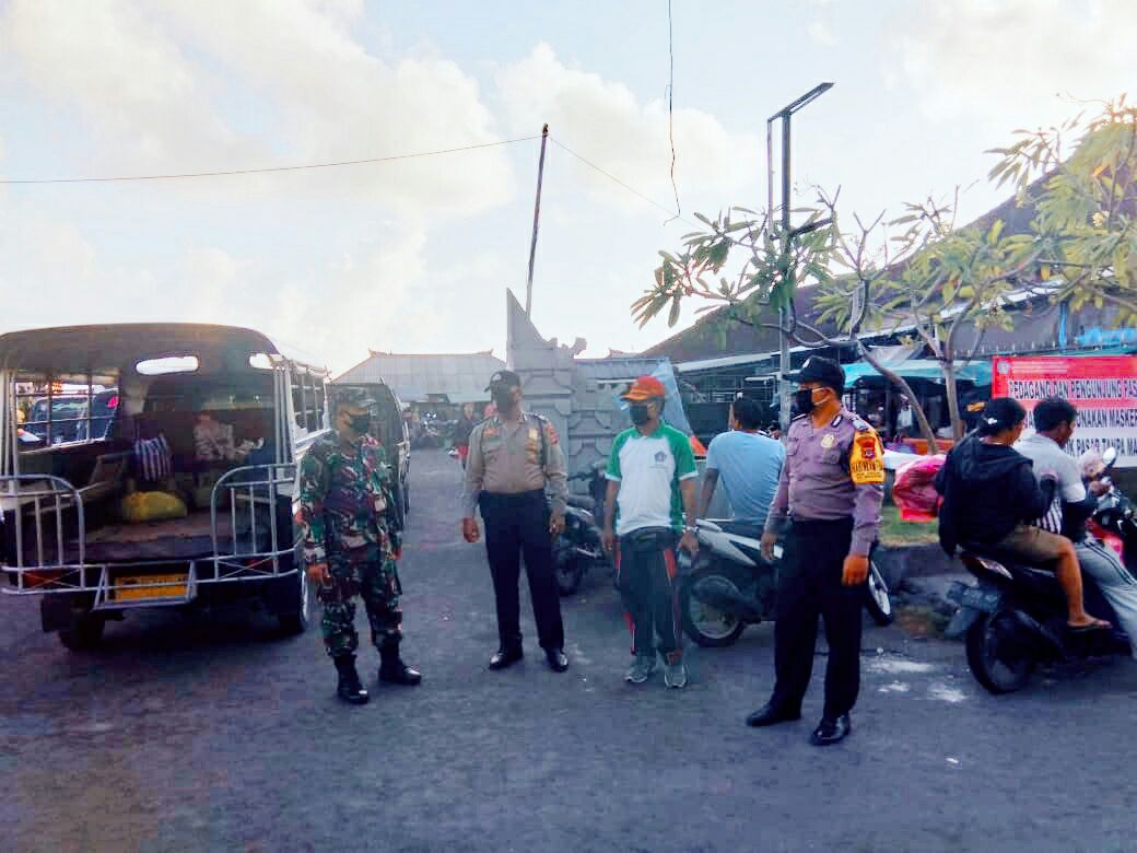 Deteksipost.com – Semarapura-Bali – Dalam menyambut Tatanan Kehidupan Era Baru sesuai dengan Visi Nangun Sat Kerthi Loka Bali melalui pola pembangunan semesta berencana menuju Bali Era Baru, Personel TNI-Polri dalam hal ini Babinsa bersama Bhabinkamtibmas Nusa Penida aktif memberikan himbauan kepada warga masyarakat di Pasar Mentigi, Dusun Sampalan, Desa Batununggul, Kecamatan Nusa Penida. Jumat (10/7/2020).