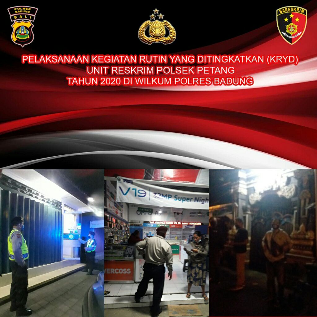 Deteksipist.com – Bali – Polda Bali, Polres Badung Dalam upaya menekan kriminalitas di Wilayah kabupaten Badung, Polsek Petang, tadi malam melaksanakan Kegiatan Rutin Yang Ditingkatkan (KRYD) melalui patroli, memantau situasi Kamtibmas, diseputaran pasar, dan dititik rawan kriminal. Jumat, (17/7).