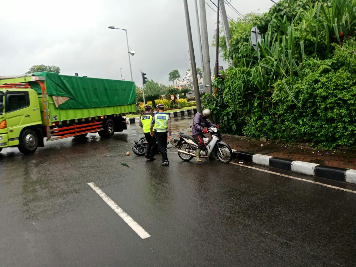 Anggota Unit Lalu Lintas Polsek Kuta Utara Aiptu Made Sutarja dan Bripka Herman, merasa kaget saat bertugas mengatur lalu lintas tiba-tiba ada pengemudi sepeda motor terjatuh karena jalanan licih.