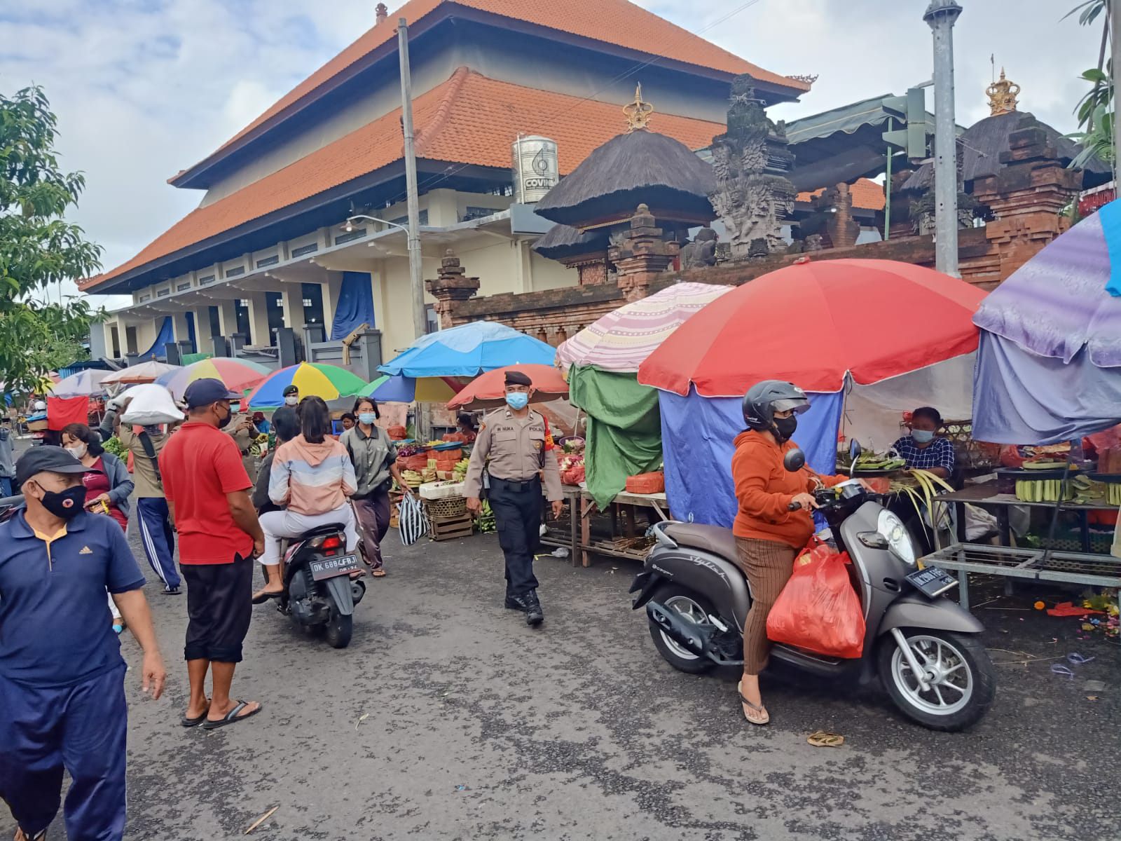 Bali – deteksipost.com – Polda Bali, Polres Badung, Polsek Abiansemal, Personil Polsek Abiansemal di Pimpin Panit 3 Samapta Ipda I Gusti Ngurah Rudirajaya bersama Instansi terkait melaksanakan pengawasan PPKM Level IV di pasar sibanggede dan pasar darmasaba, Kecamatan Abiansemal, Jumat (10/9) pagi.