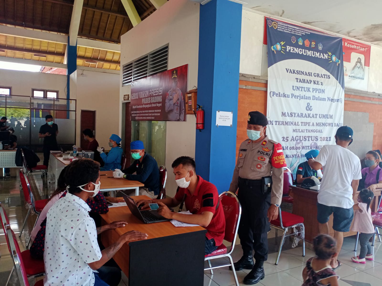 Bali – deteksipost.com – Polda Bali, Polres Badung, Polsek Mengwi, Kanit Samapta Polsek Mengwi Iptu I Dewa Suriyawan, S.Sos awasi kegiatan vaksinasi diterminal Mengwi (15/11). Pagi