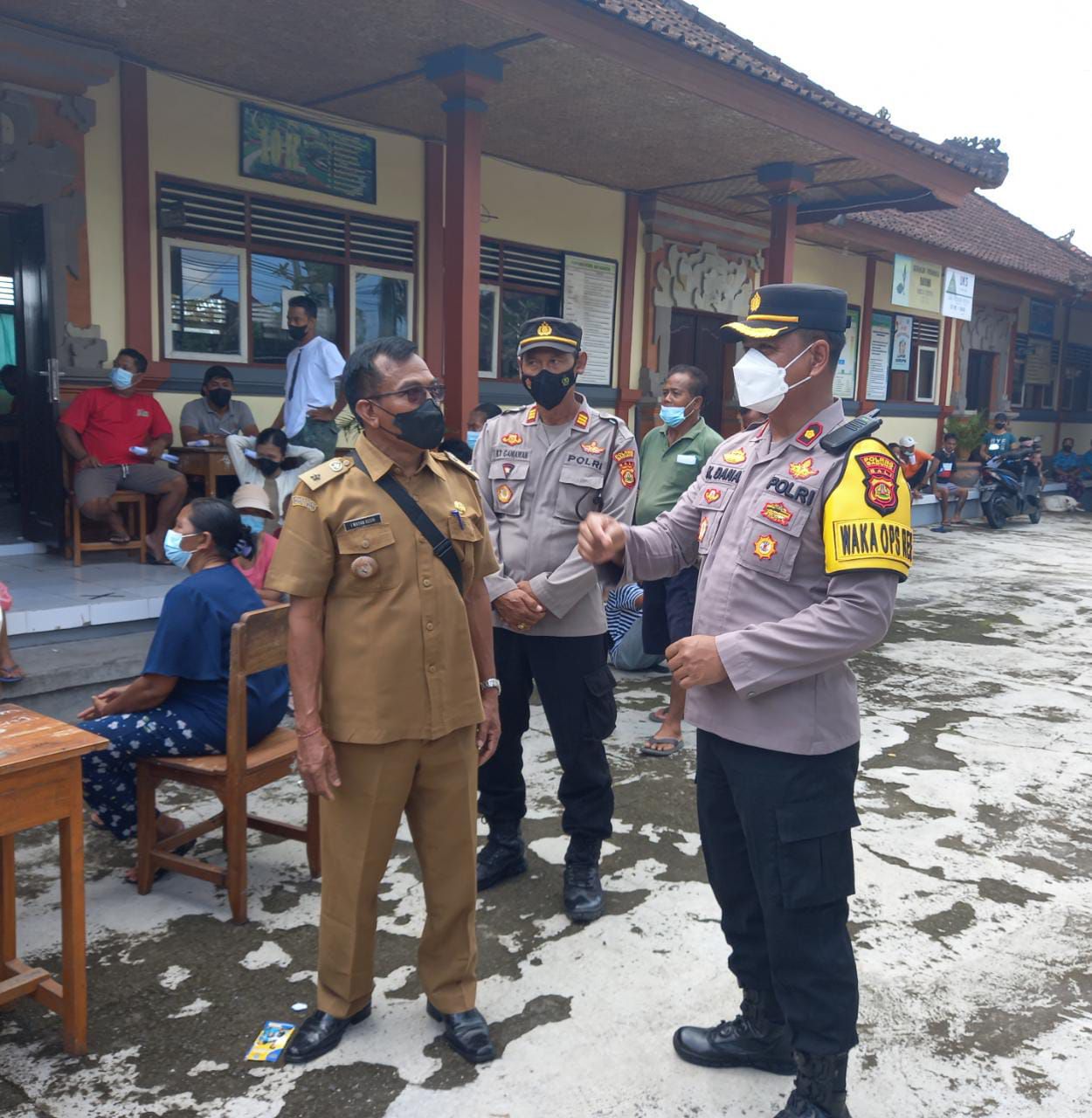 Waka Polres Badung Kompol I Ketut Dana, S.H didampingi oleh Waka Polsek Mengwi AKP I Ketut Ganiawan, S.Sos meninjau langsung pelaksanaan kegiatan vaksinasi tersebut