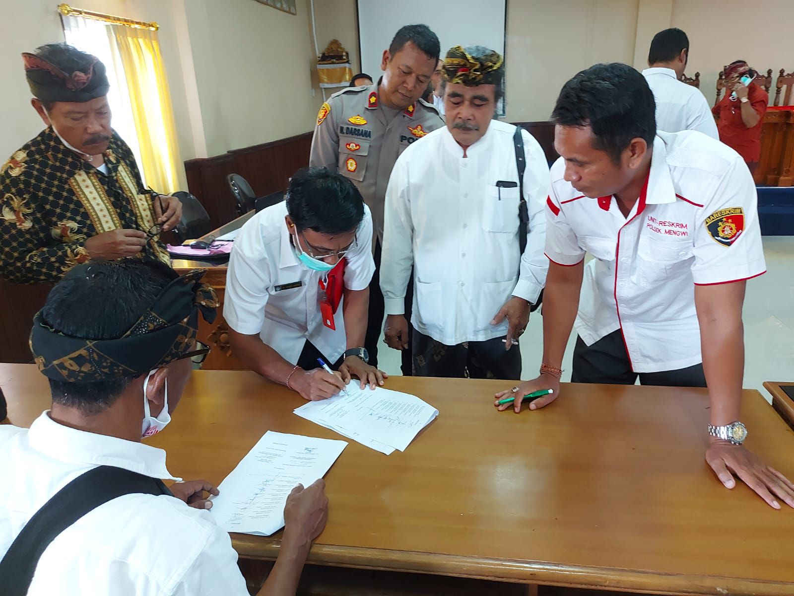 Dari hasil mediasi tersebut, kata Kapolsek, warga Banjar Kangin mendapatkan kesepakatan dan usulan untuk menujuk perwakilan 5 kelihan adat dan dinas. Menuntut oknum kelihan adat dan dinas Banjar Babakan kawan sebagai pembuat surat untuk membuktikan surat tersebut tetap secara hukum. Menuntut apabila tersebut tidak bisa membuktikan oleh oknum tersebut, agar membuat pernyataan dan meminta maaf kepada warga Banjar Kangin secara lisan di paruman. Serta Babakan kawan tidak mengulangi perbuatan seperti ini lagi. Selanjutnya Babakan kawan membuat surat pernyataan dengan bermatrai 10 ribu dengan ditanda tangani kedua belah pihak dan saksi.