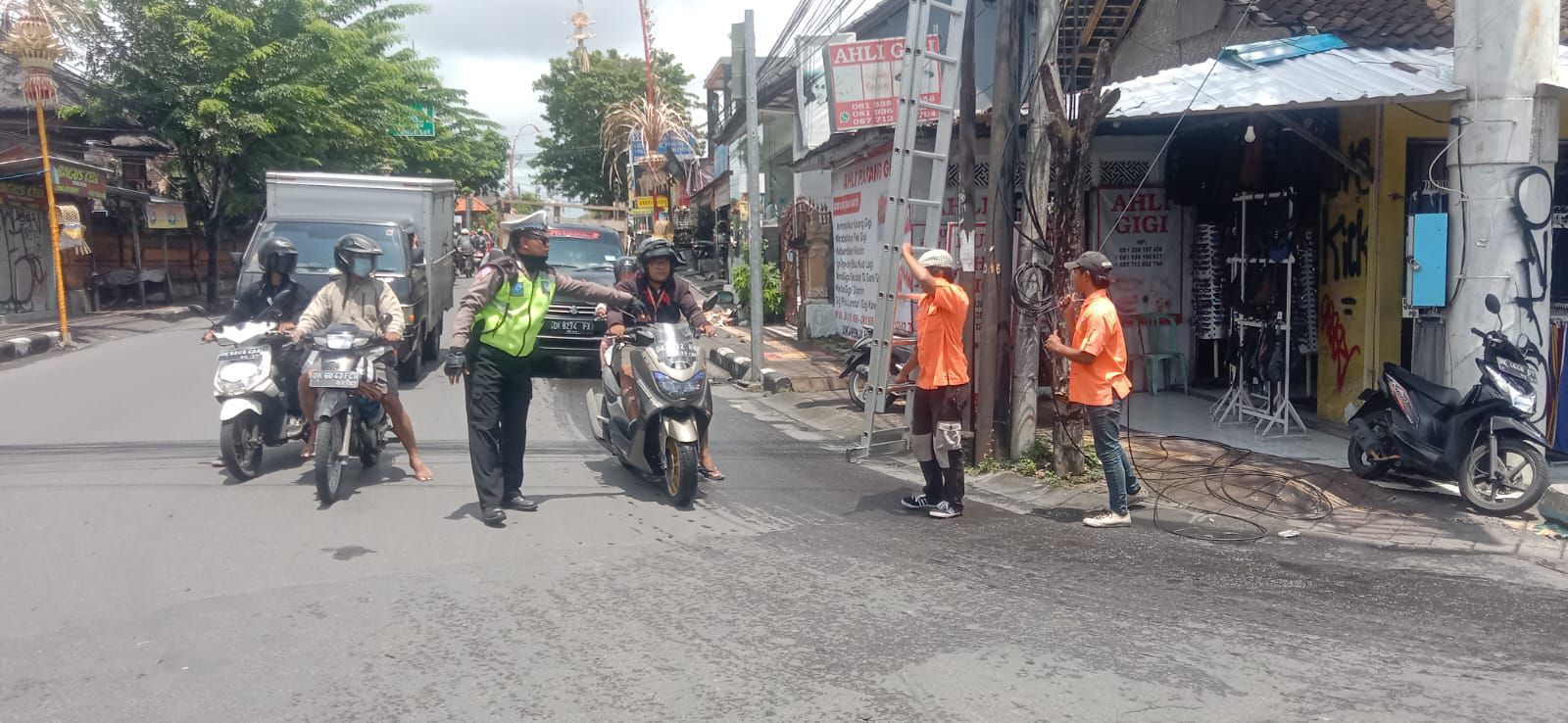 BALI – DETEKSIPOST.COM – Polda Bali, Polres Badung Salah satu anggota Satuan Lalu Lintas Polres Badung Aiptu Putu Atiasa, cekatan menyetop arus lalu lintas di Depan Pasar Adat Sempidi. Pasalnya petugas dari PLN sedang memasang kabel listrik di sepanjang jalan Raya Sempidi, Kecamatan Mengwi, Kabupate Badung. Senin, (23/1) pagi