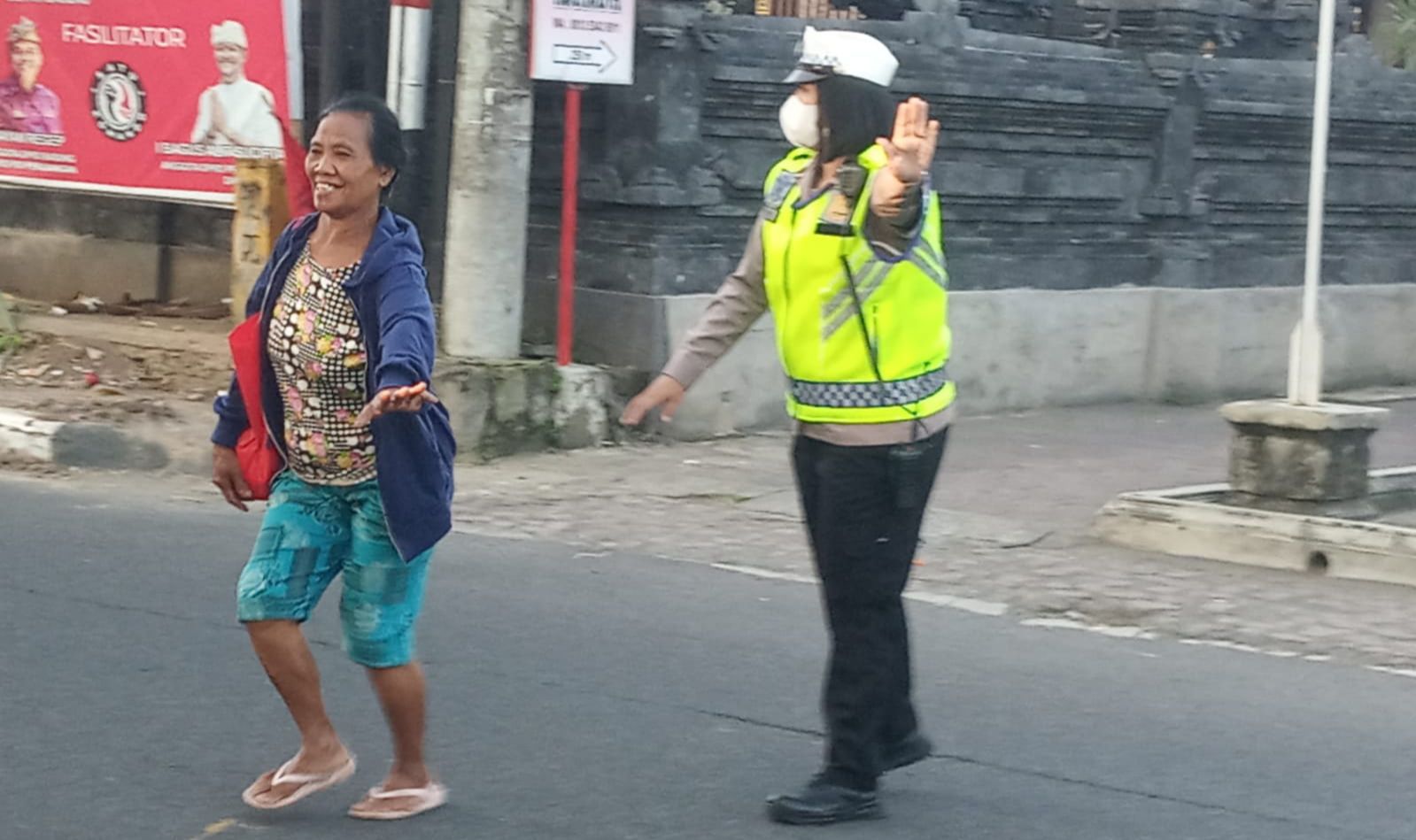Seperti halnya yang dilakukan oleh anggota Polwan Satuan Lalu Lintas Polres Badung Bripka Dewi Tastraeni, nampak sibuk melakukan pengaturan lalu lintas yang lumayan padat, disaat bersamaan ada seorang ibu-ibu hendak menyeberang jalan, dengan cekatan Bripka Dewi menggandeng tangan ibu-ibu tersebut dan menyeberangkannya.