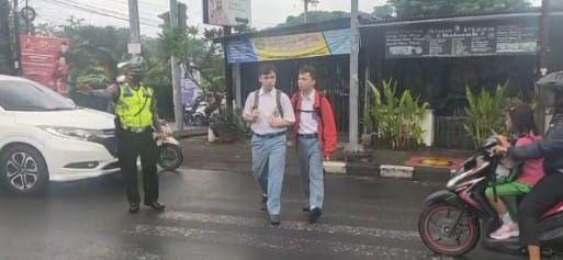 BALI – DETEKSIPOST.COM – Polda Bali, Polres Badung, Polsek Kuta Utara Untuk menjaga keselamatan anak anak sekolah yang akan menyebrang Personil Unit Lalu Lintas Polsek Kuta Utara membantu menyebrangkan jalan di simpang TL Dalung, Desa Dalung, Kecamatan Kuta Utara, Kabupatem Badung. Senin (31/1) pagi.