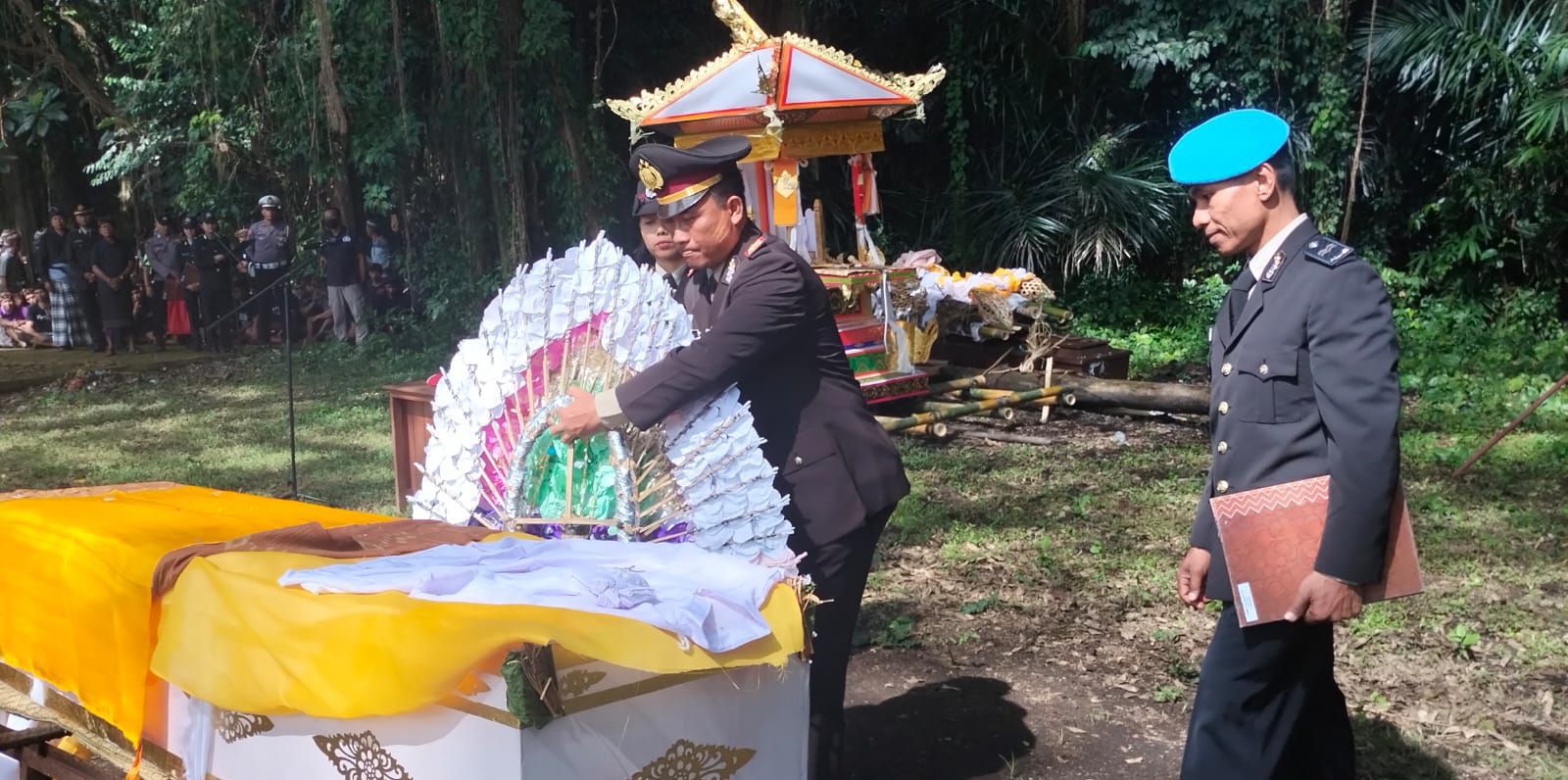 Setelah selesai pelaksanaan upacara perabuan jenazah secara dinas kepolisian kemudian dilanjutkan dengan upacara pengabenan secara adat.(tim).