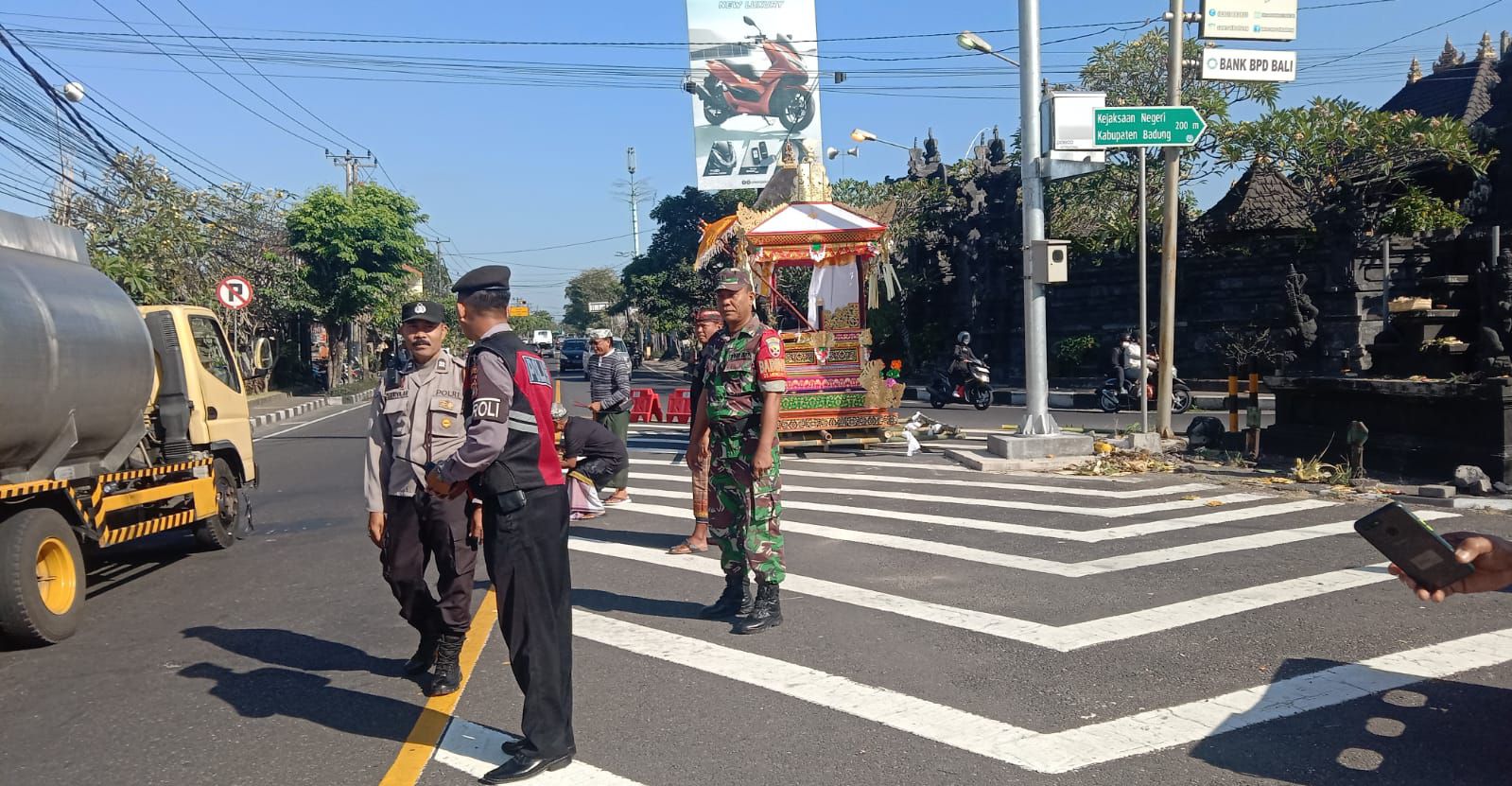 “Kita bantu melakukan pengaturan arus lalulintas dan penyebrangan saat iring-iringan pengantar jenazah (bade) melintasi jalan utama”, ucap Aiptu Surya Arsana.