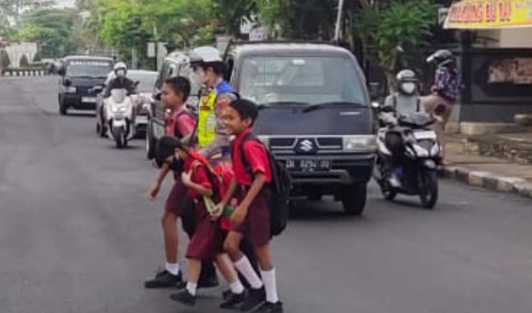 Ditengah-tengah kesibukannya, nampak beberapa anak dari SD No. 4 Mengwitani yang ingin memasuki wilayah sekolah dan mengharuskan menyeberangi padatnya jalan raya lalu lintas. Pelayanan utama memberikan kenyamanan dan keselamatan masyarakat area lalu lintas dengan memberikan perhatian bagi pengguna jalan. Secara sigap Aipda Ni Luh Putu Eristyawati, S.H. menyeberangkan anak-anak tersebut untuk menjamin keselamatannya.