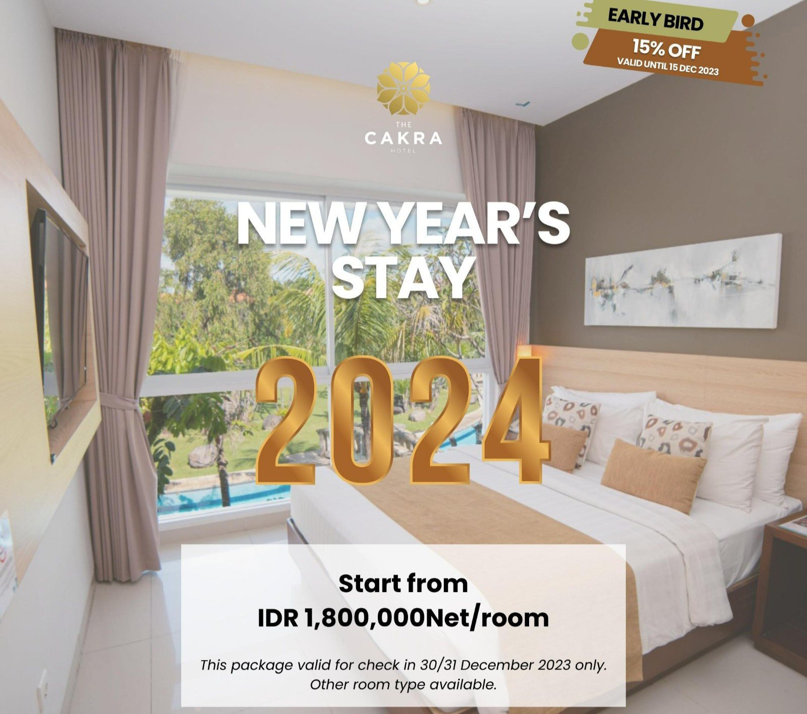 Paket New Year’s yang dimulai dari harga IDR 1.800.000 Net termasuk menginap di superior room selama 2 (dua) malam, makan pagi dan Gala Dinner New Year’s yang diadakan pada tanggal 31 desember 2023.