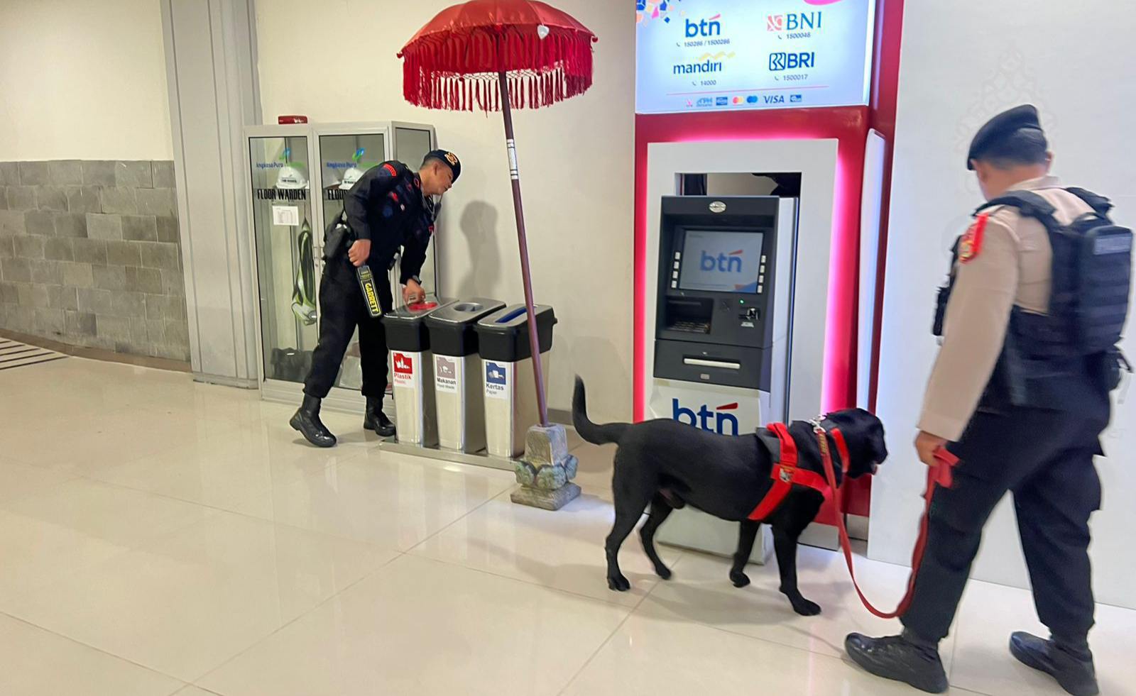 Keterangan foto; Satgas Sterilisasi Ops Puri Agung dari Gegana Brimob Polri dan K.9, sterilisasi kawasan Bandara I Gusti Ngurah Rai Bali.