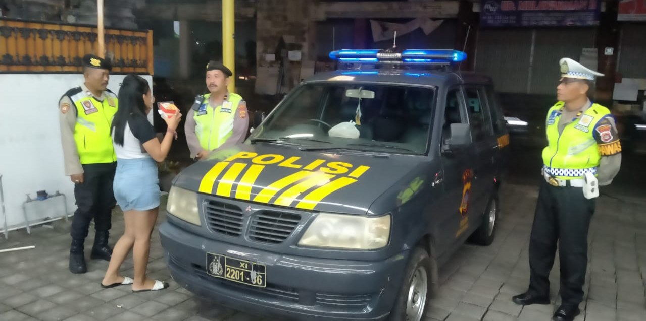Keterangan foto; Berikan Himbauan Kamtibmas, Blue Light Patrol Polsek Abiansemal Sambangi Pertokoan