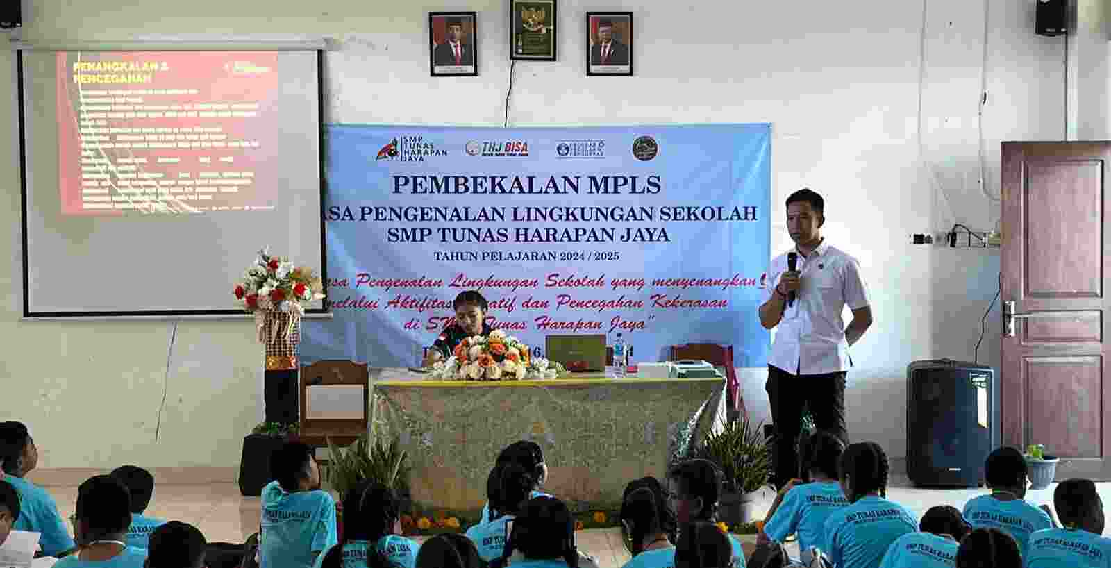 Melalui kegiatan Masa Pengenalan Lingkungan Sekolah, Polsek Denpasar Selatan berikan penyuluhan pencegahan berkembangnya kenakalan remaja, di lingkungan sekolah.