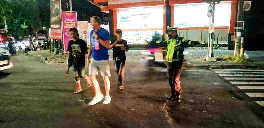 Keterangan foto; Unit Lantas Polsek Kuta Utara Blue Light Patrol Dan Sebrangkan Pejalan Kaki