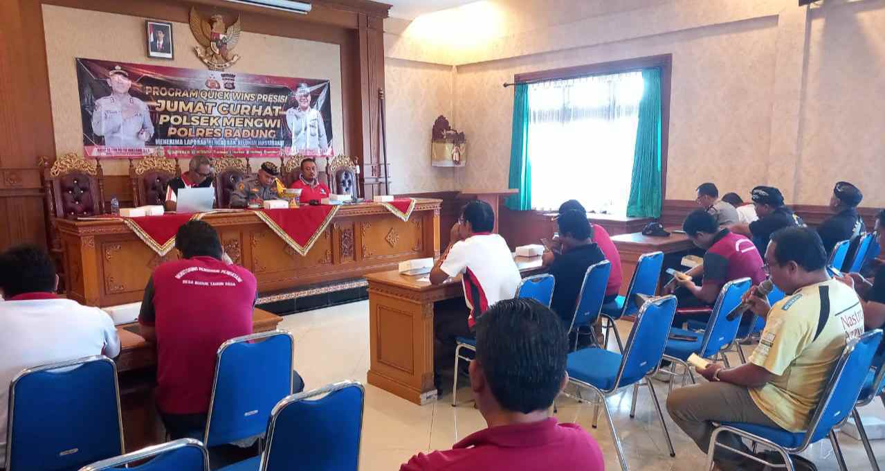 “Kami dari Polsek Mengwi secara rutin melaksanakan kegiatan Jumat Curhat untuk mendengarkan langsung keluhan masyarakat”, ucapnya