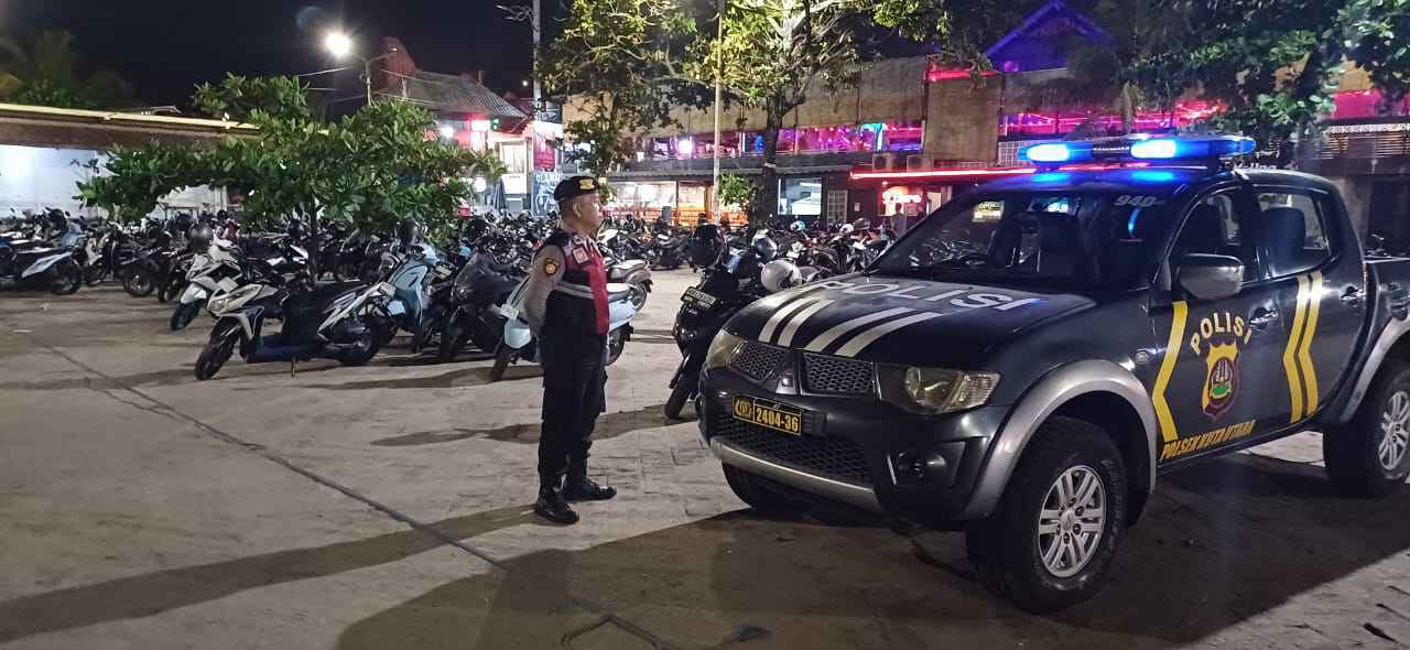 Pelaksanaan patroli dengan menggunakan kijang 940 Kuta Utara menyasar kawasan obyek wisata dan parkiran pantai Batu Bolong, Desa Canggu, Kecamatan Kuta Utara, Kabupaten Badung saat pengunjung ramai menikmati suasana hiburan malam.