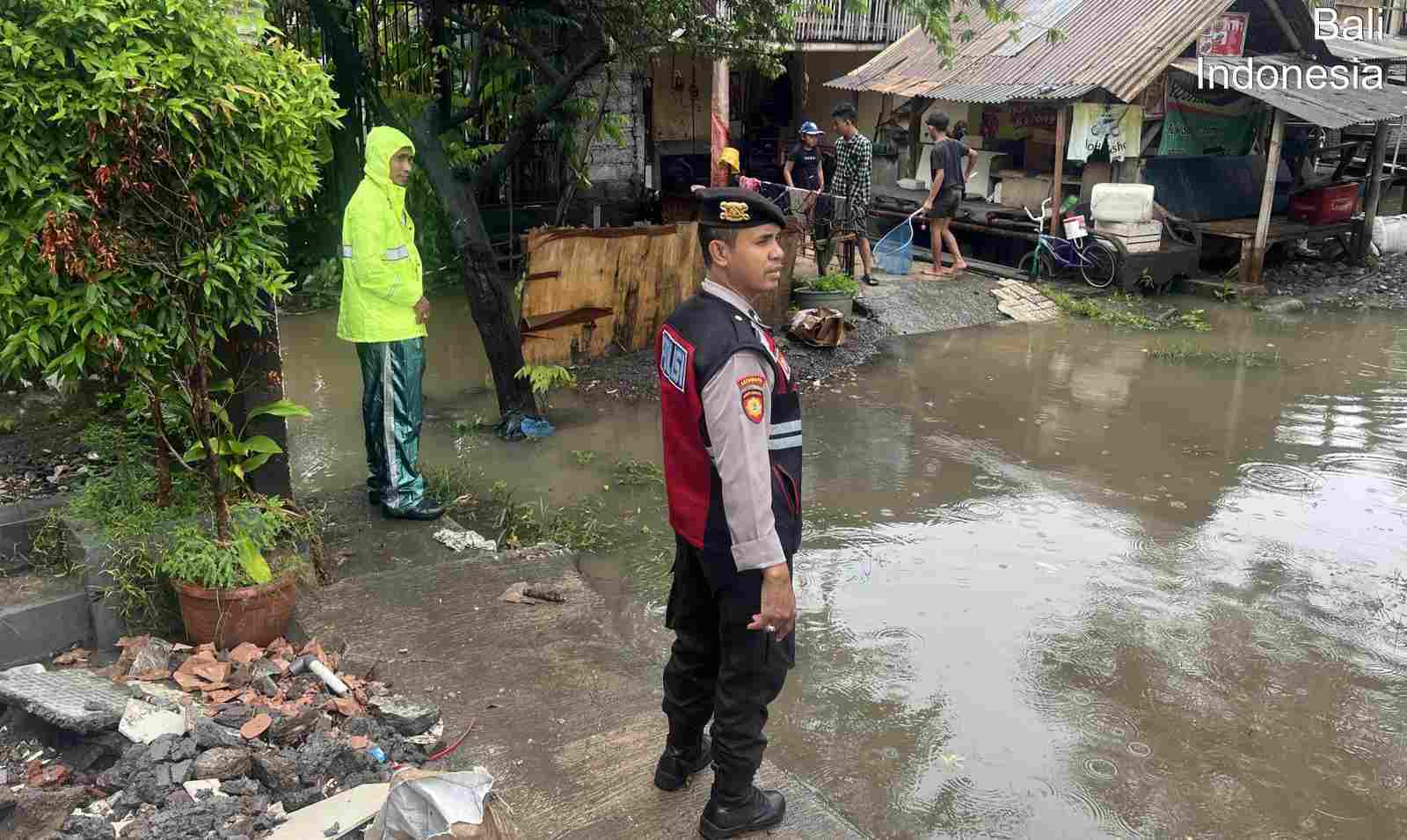 Keterangan; Personel Sat Samapta Polresta Denpasar Laksanakan Patroli Pantau Situasi Keamanan dan Genangan Air di Denpasar
