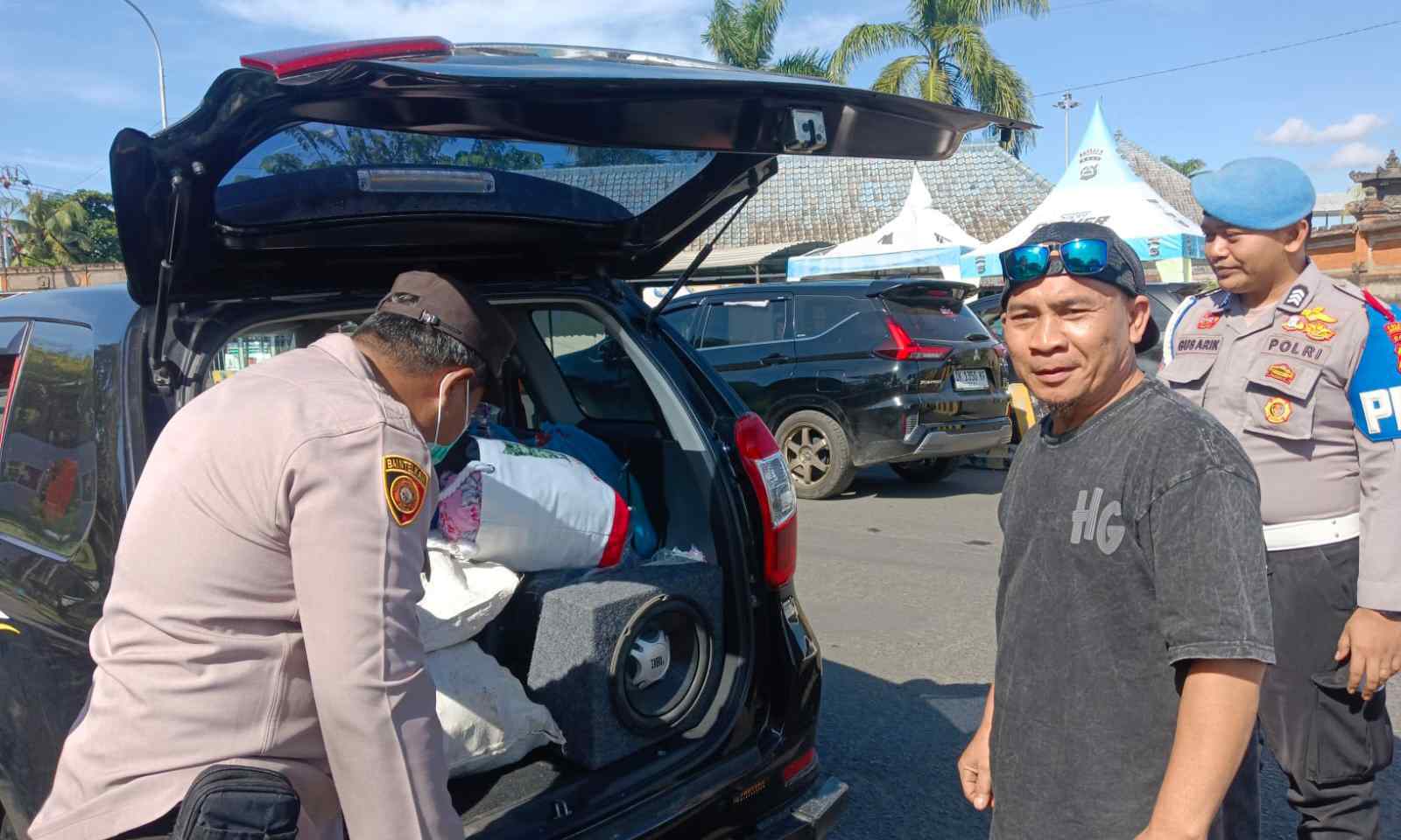 Selain memeriksa identitas, personel Polda Bali yang terlibat Ops Ketupat Agung-2025 juga memeriksa barang bawaan dan kendaraan yang melintas secara teliti dengan bantuan anjing K9.