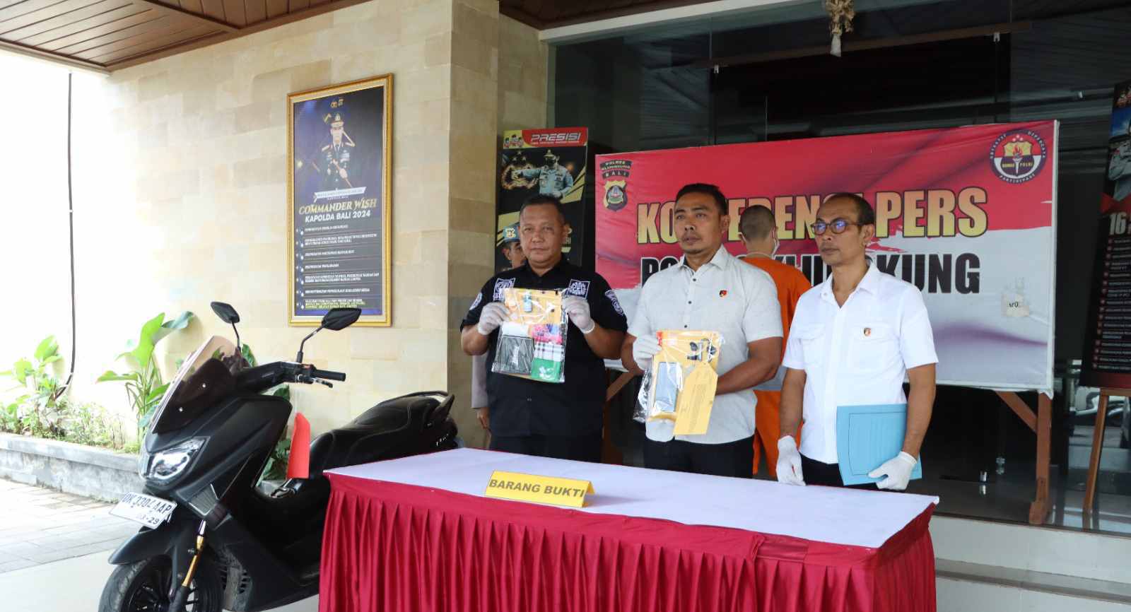 Dalam konferensi pers tersebut, AKP I Wayan Gede Mudana memaparkan kronologis penangkapan terhadap satu orang tersangka laki-laki berinisial MRK alias RK, yang berhasil diamankan pada hari Sabtu, 17 Mei 2025, sekitar pukul 22.30 WITA, di sebuah rumah kost yang berada di sebuah gang di Jalan Hos Cokroaminoto, Kelurahan Semarapura Tengah, Kecamatan Klungkung, Kabupaten Klungkung.