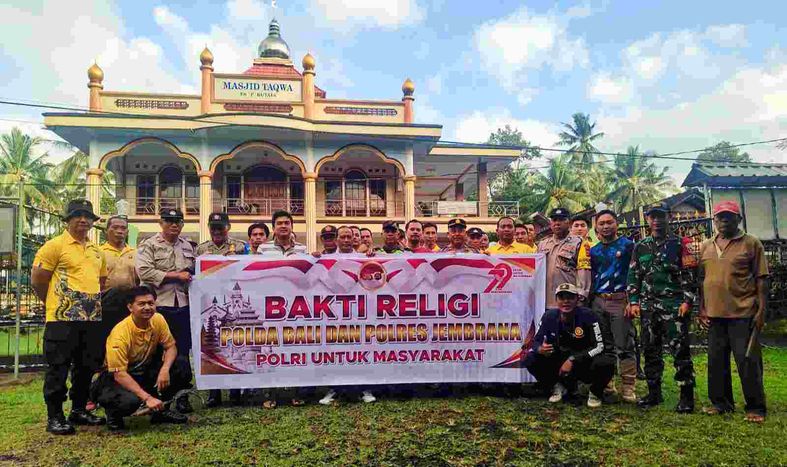 Bali – deteksipost.com – Menjelang peringatan Hari Bhayangkara ke-79, jajaran Polsek Pekutatan melaksanakan kegiatan bakti religi dan sosial di Masjid Taqwa, Desa Pekutatan, Kecamatan Pekutatan, Kabupaten Jembrana, Bali, Jumat (13/6/2025) pagi.