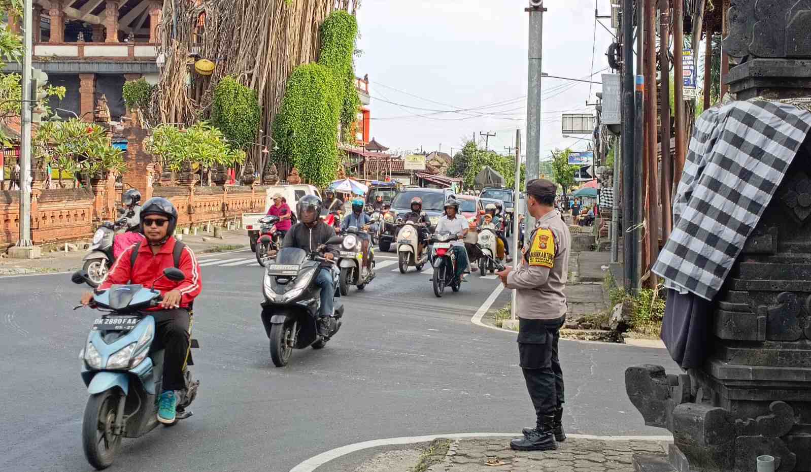 Selain melakukan pengaturan lalu lintas, personel juga memberikan imbauan kepada pengendara untuk tertib berlalu lintas, menggunakan helm, dan tidak melanggar marka jalan.