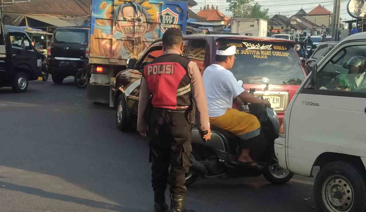 Personel Polsek Abiansemal hadir langsung di lapangan untuk mengatur arus lalu lintas, membantu penyeberangan warga, serta memberikan imbauan tertib berlalu lintas kepada para pengguna jalan.