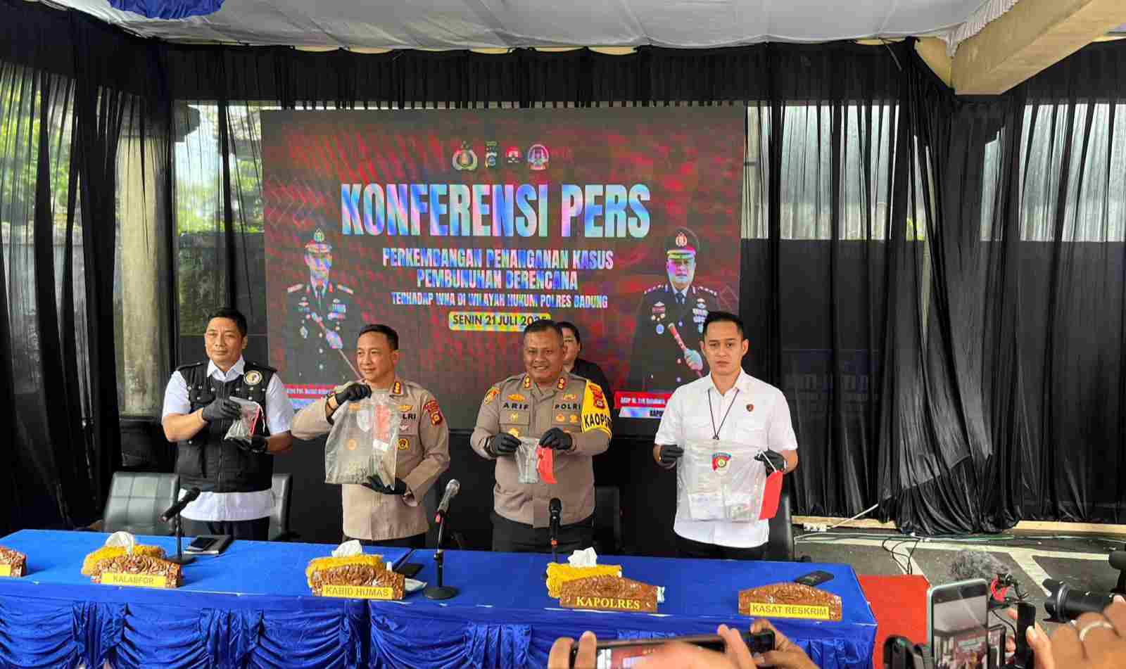 Bali – deteksipost.com – Mewakili Kapolda Bali Kabid Humas Kombes Pol Ariasandy S.I.K., didampingi Kabid Labfor Kabid Kombes pol I Made Swetra, S.Si., M.Si. dan Kapolres Badung AKBP Arif Batubara S.H., S.I.K., M.H., serta Kasat Reskrim saat konfrensi pers di Loby Mapolres Badung, pada senin 21 juli 2025.
