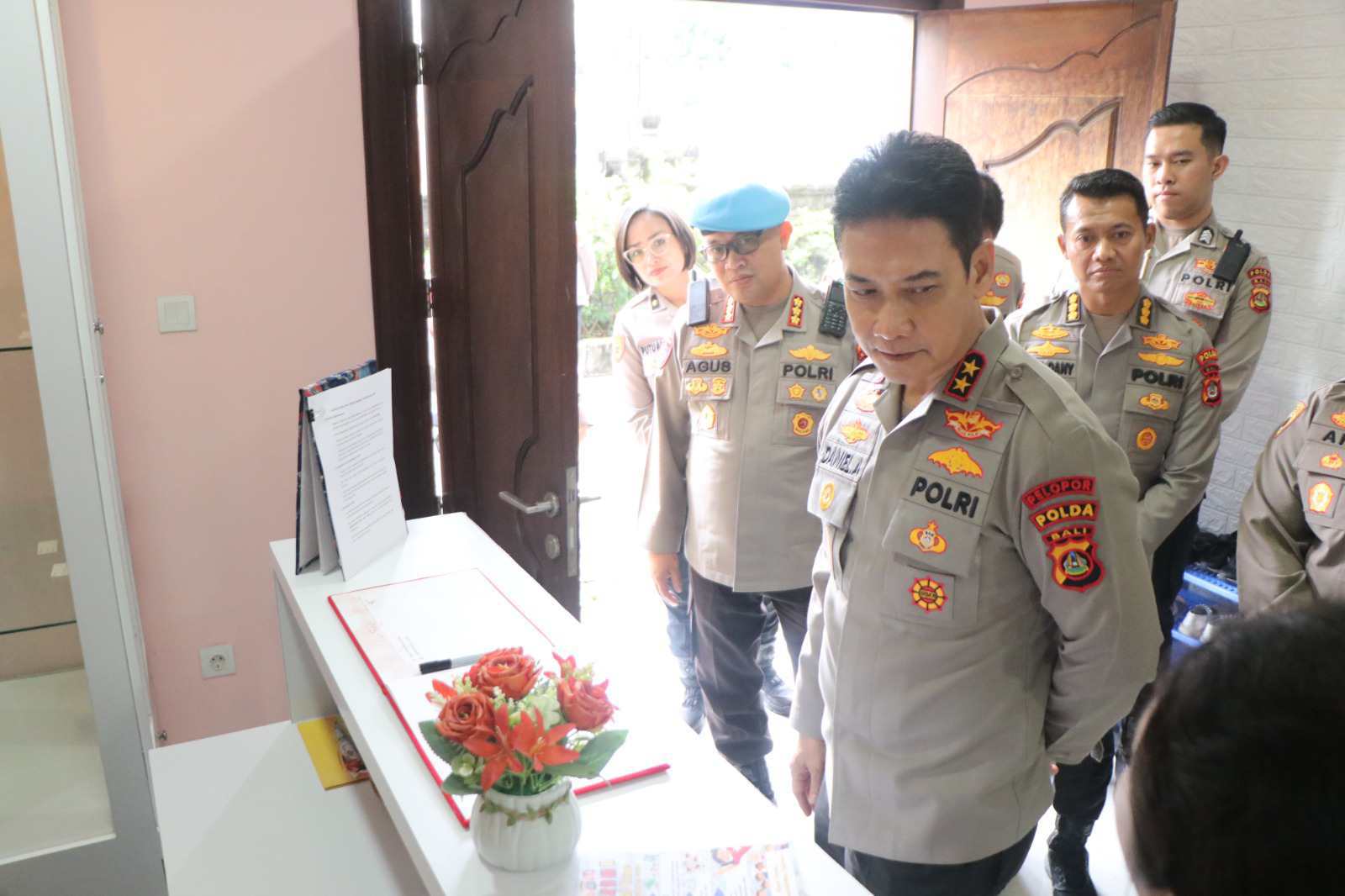 Kapolda Bali, Irjen Pol. Daniel Adityajaya, S.H., S.I.K., M.Si. didampingi Wakapolda Bali, Brigjen Pol. I Komang Sandi Arsana, S.I.K., M.H. dan Karo SDM Polda Bali, Kombes Pol. Dr. Sigit Dany Setiyono, S.H., S.I.K., M.Sc. (Eng) mengecek langsung ruangan Dharma Kids Care yang berada di lantai 1 Gedung Presisi Polda Bali, Senin (25/8/2025).