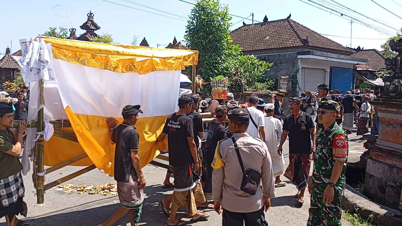 Bali – deteksipost.com – Polres Klungkung – Bhabinkamtibmas Desa Satra, Aiptu I Wayan Antara, bersama Babinsa Desa Satra melaksanakan pengamanan kegiatan upacara adat Pitra Yadnya (Ngaben) di Banjar Kangin, Desa Adat Satra, Kabupaten Klungkung, (14/9).
