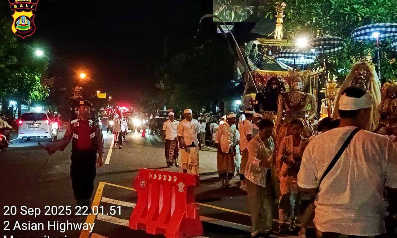 Bali – deteksipost.com – Mengwi – Polsek Mengwi melaksanakan pengamanan sekaligus pengaturan arus lalu lintas dalam rangkaian piodalan di Pura Khayangan Anyar, Desa Mengwitani, Kecamatan Mengwi, Kabupaten Badung. Sabtu (20/9/2025) pukul 21.00 wita