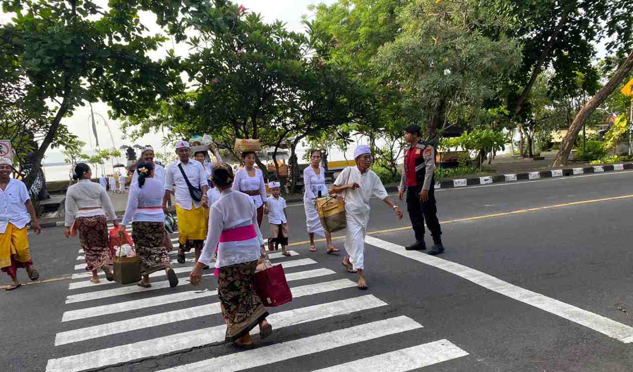 Pengamanan dan pengaturan lalu lintas dilakukan terhadap masyarakat yang melaksanakan persembahyangan dalam rangka Pujawali di Pura Goa Lawah, khususnya saat umat melintas dan menyeberang jalan menuju Pura Segara Goa Lawah. Personel tampak aktif membantu penyeberangan guna mencegah terjadinya kemacetan serta potensi kecelakaan lalu lintas.