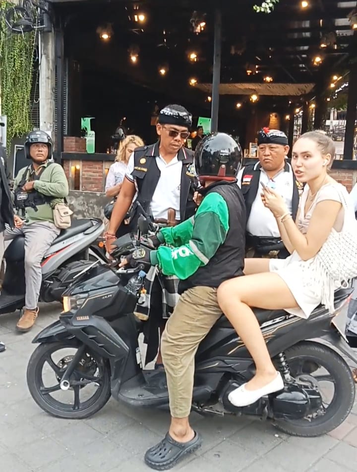 Keterangan foto; Pecalang Desa Adat Kuta, sidak kepada para ojol ilegal yang tidak memiliki aplikasi tetapi memakai baju ojol lengkap.