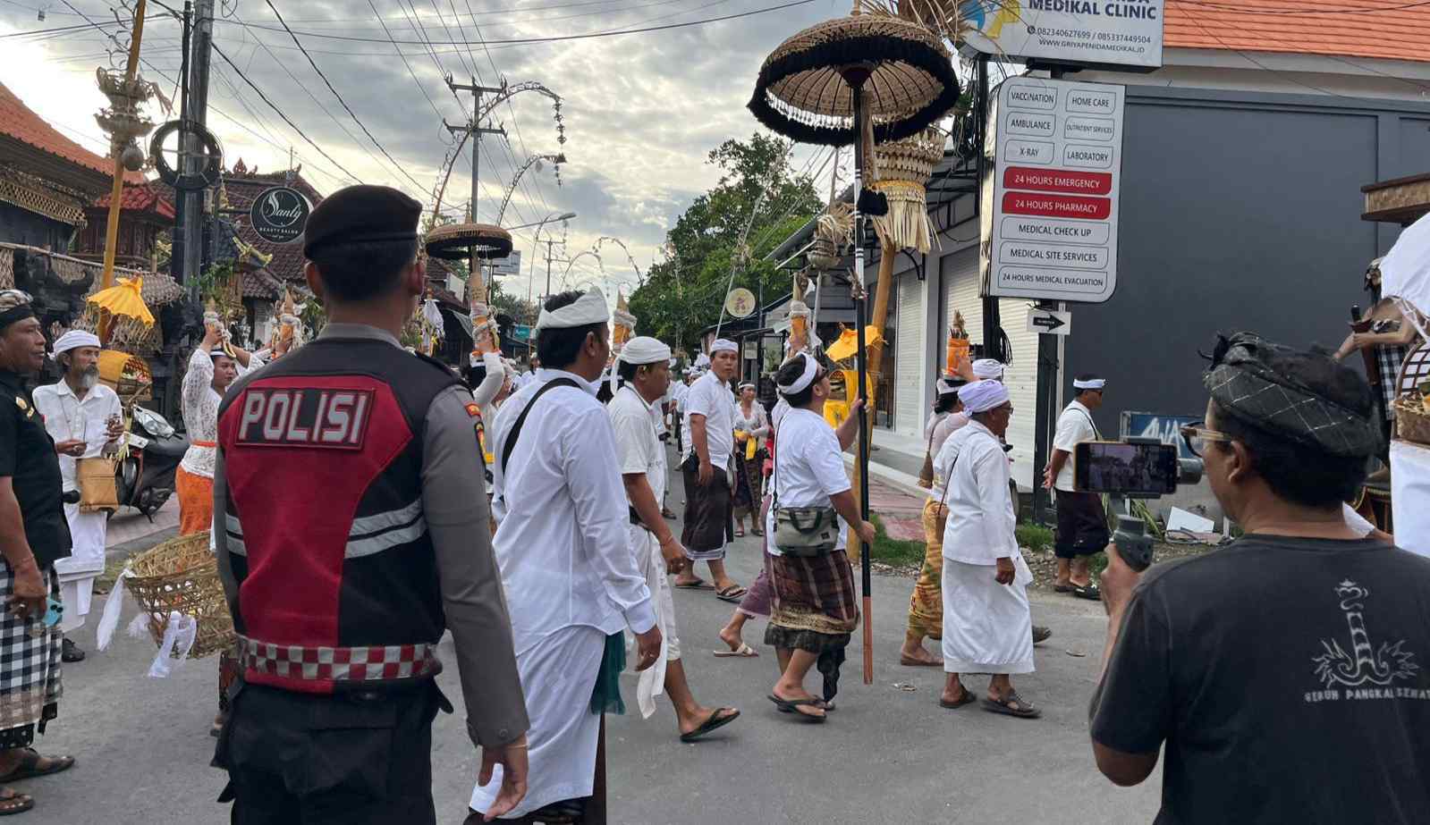 Dalam pelaksanaannya, personel Polri bersinergi dengan pecalang Desa Adat setempat untuk memastikan kegiatan berjalan tertib dan lancar.