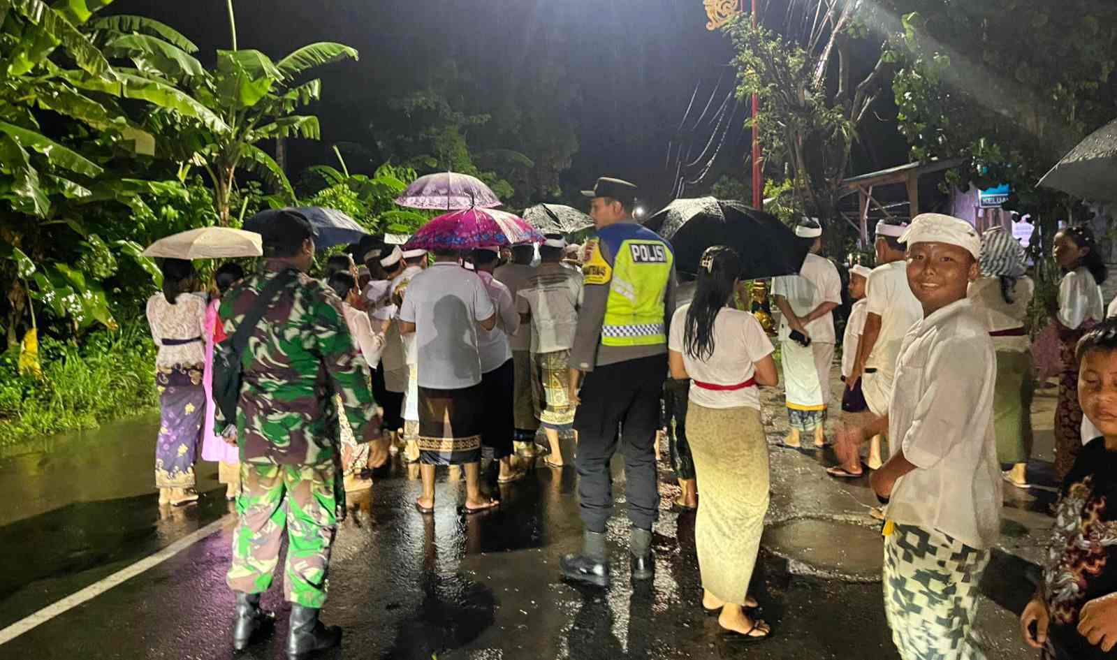 Kegiatan pengamanan dilakukan guna memastikan rangkaian upacara adat berjalan dengan aman, tertib, dan lancar. Dalam pelaksanaannya, Bhabinkamtibmas bersama Pecalang Desa Adat Kutampi melakukan pengaturan arus lalu lintas di sekitar lokasi upacara, mengingat kegiatan tersebut melibatkan banyak warga serta menggunakan akses jalan utama desa.