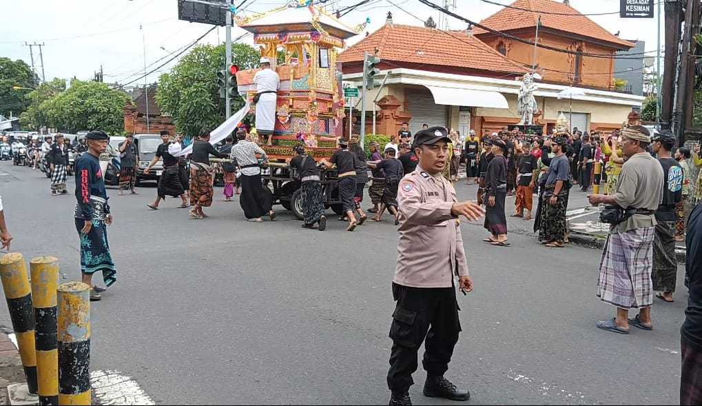 Dalam pelaksanaan prosesi, Bhabinkamtibmas Desa Kesiman Petilan bersinergi Pecalang Banjar Batanbuah dan Pecalang Banjar Bukit Buwung, untuk memastikan kelancaran arus lalu lintas dan menjaga situasi kamtibmas tetap kondusif sepanjang jalur yang dilalui iring-iringan.