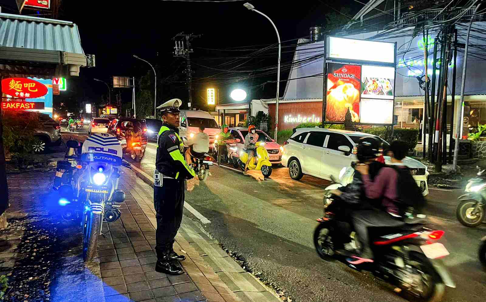 BALI – DETEKSIPOST.COM – Kuta Utara. Polsek Kuta Utara melalui Unit Lalu Lintas terus meningkatkan pelayanan terhadap pengguna jalan raya dalam upaya meminimalisir terjadinya kemacetan dan kecelakaan lalu lintas, dengan melakukan pengaturan arus lalu lintas. Sabtu (14/3/2026) pukul 22.00 Wita.