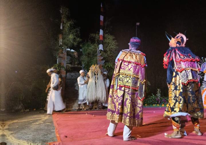 BAli – DETEKSIPOST.COM – Polres Klungkung – Bhabinkamtibmas Desa Sakti, Polsek Nusa Penida, Bripka I Made Susila bersama piket Polsek Nusa Penida bersinergi dengan pecalang Banjar Adat Sebunibus melaksanakan pengamanan pementasan Calon Arang yang digelar di Desa Adat Sebunibus, Desa Sakti, Kecamatan Nusa Penida, Kabupaten Klungkung, (29/4).